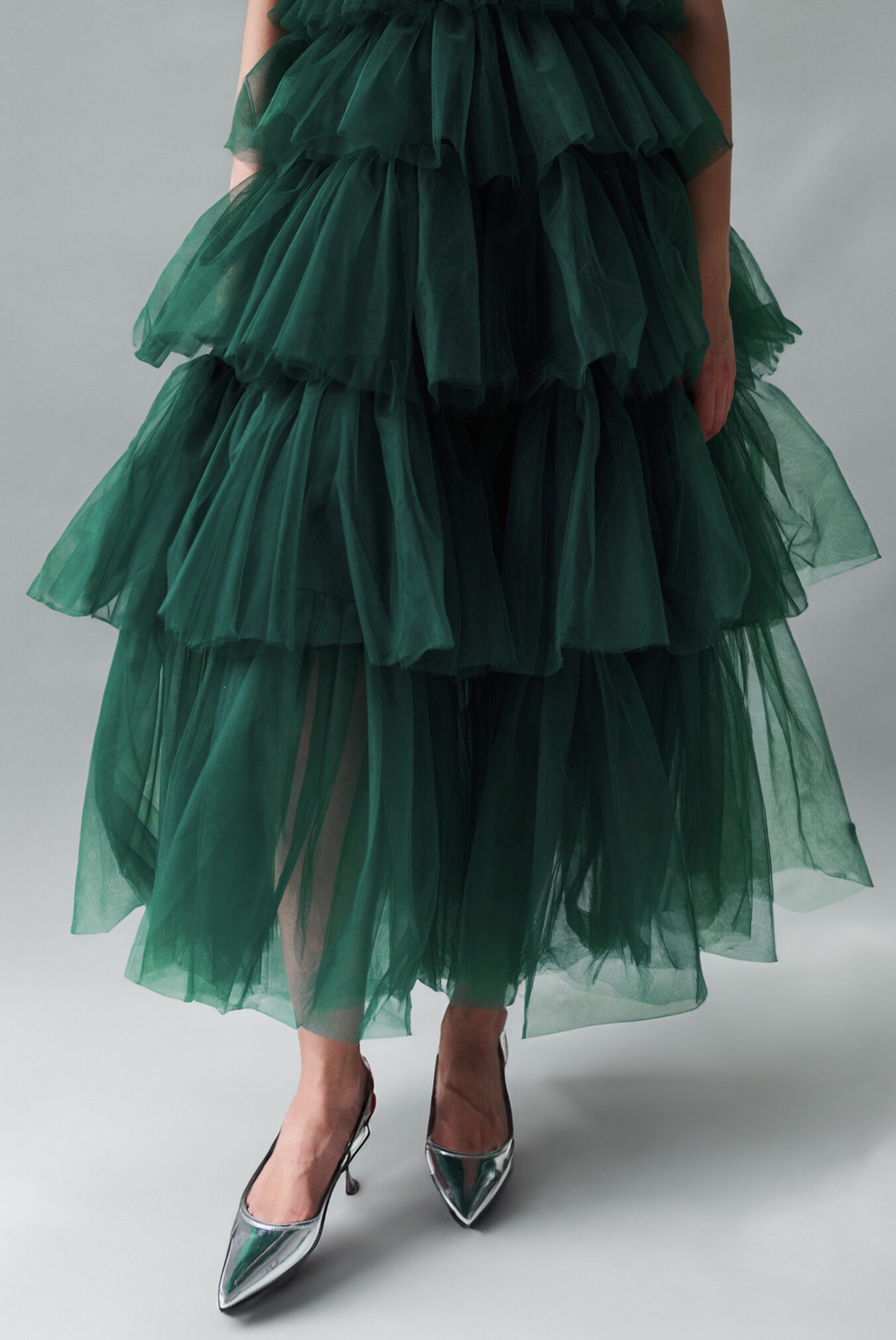Tiulowy komplet został stworzony dzięki inspiracji delikatności i lekkości firanki. Spódnica i top odznaczają się charakterystycznymi cechami firanki, emanując delikatnością dzięki dobranym materiałom. Wykorzystane zostały lekkie, przezroczyste tkaniny, które pozwalają skórze subtelnie migać spod warstw materiału, podkreślając jednocześnie romantyczny charakter całej kreacji.