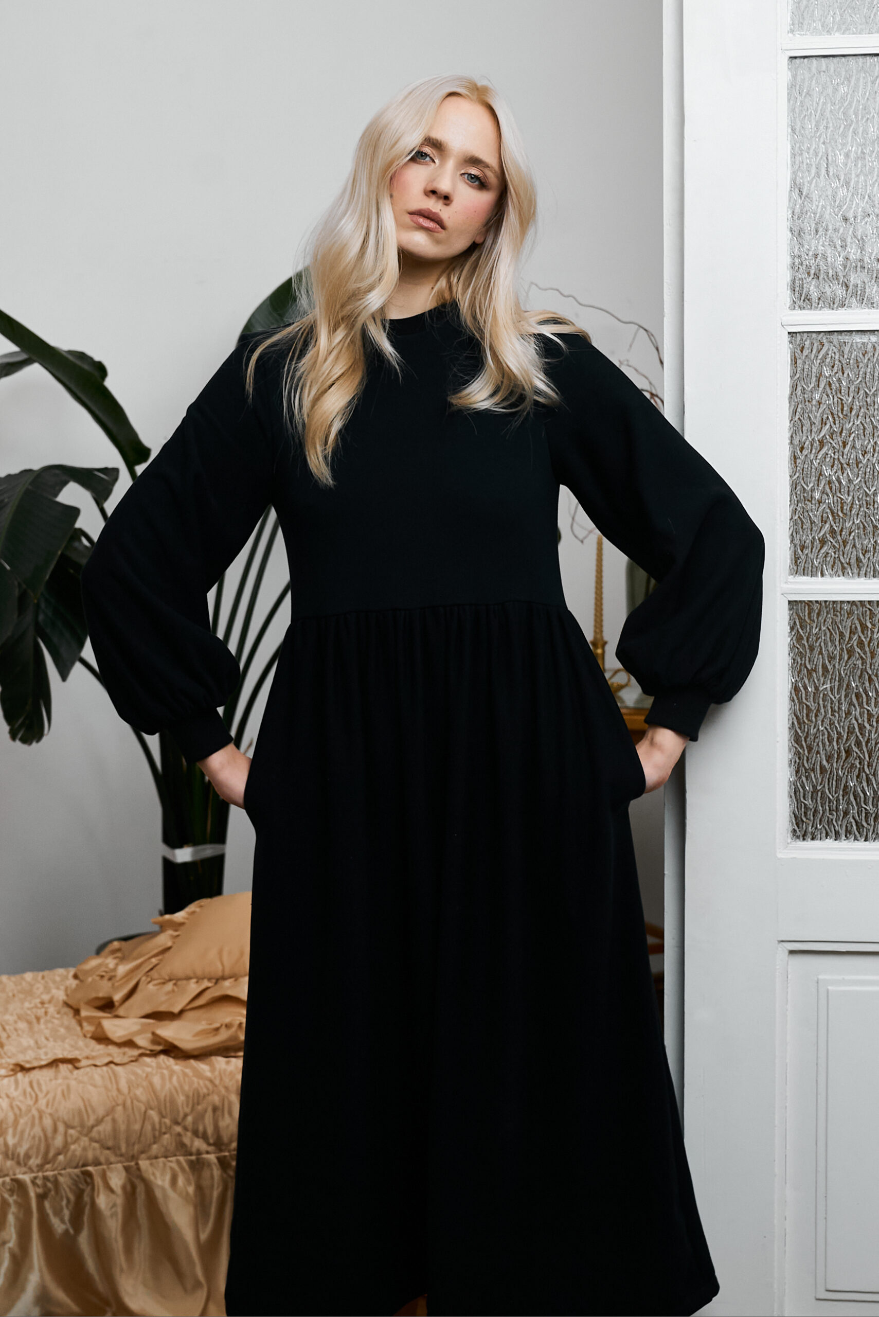 Sukienka posiada kieszenie ukryte w bocznych szwach.